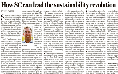 South Carolina has much to offer, but it ranks close to last in its ability to recycle single-use plastics. Wes Carter, president of Atlantic Packaging, proposes some policies and infrastructure ideas that could help protect the wildlife and nature of this beautiful state.