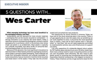 Packaging president and founder of A New Earth Project, Wes Carter, for their 5 Questions column all about emerging technologies in the packaging industry and his advice for implementing sustainable practices.