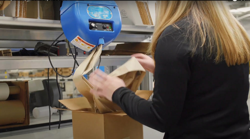 The semi-automatic paper void fill dispenser is ideal for high speed packing environments for e-commerce operations involving apparel, gear, jewelry, and accessories. Void fill is dispensed on-demand by foot pedal operation quickly and easily to fill open space within the box and lock your product into place.